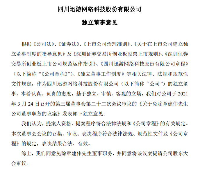 2021年3月,迅游科技审议通过了《关于免除章建伟先生公司董事职务的议案》,章建伟被彻底踢出局,“铁三角”变成了“两人对垒”。