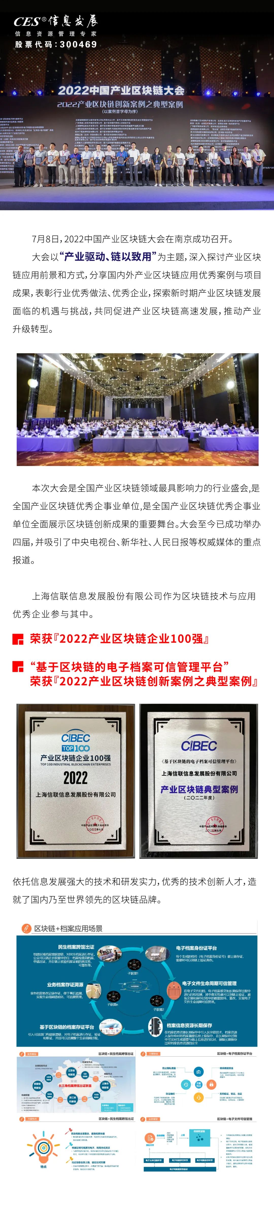 祝贺信息发展(300469)荣获2022年产业区块链企业100强及创新案例之典型案例奖