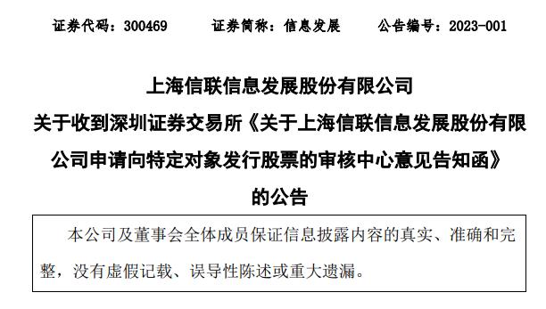 中国经济网北京1月5日讯上海信联信息发展股份有限公司(简称“信息发展”,300469.SZ)昨晚发布关于收到深圳证券交易所《关于上海信联信息发展股份有限公司申请向特定对象发行股票的审核中心意见告知函》的公告。信息发展于2023年1月4日收到深圳证券交易所上市审核中心出具的《关于上海信联信息发展股份有限公司申请向特定对象发行股票的审核中心意见告知函》。