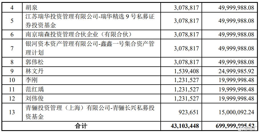 信息发展(300469.SZ)公布向特定对象发行股票上市公告书,最终确定本次发行价格为16.24元/股,发行股数4310.3448万股,募集资金总额约7.0亿元。本次发行对象最终确定为13家。本次发行配售结果如下: