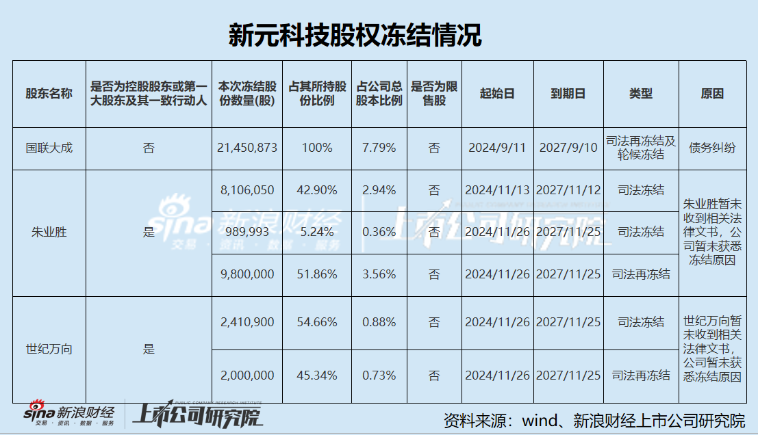 新元科技卷入合同纠纷和银行贷款逾期诉讼的同时,其重要股东所持公司股份也遭司法冻结。