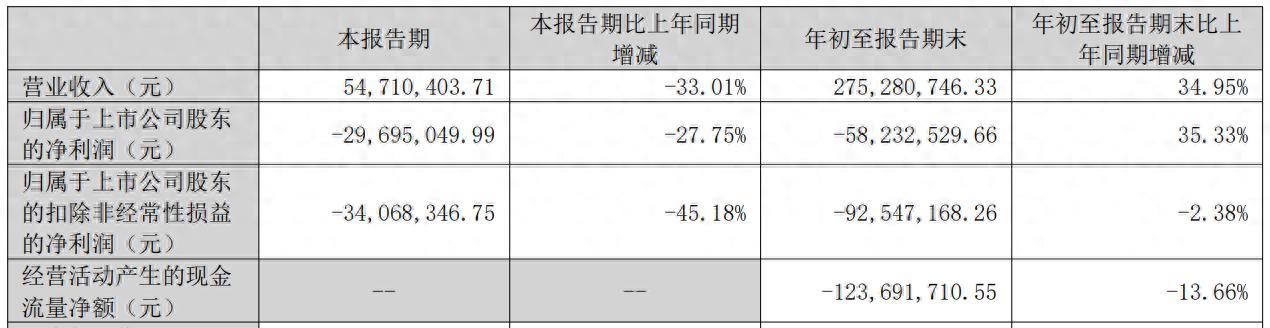 2024年前三季度,该公司营业收入为2.75亿元,同比增长34.95%;归属于上市公司股东的净利润为-5823.25万元,同比增长35.33%;经营活动产生的现金流量净额为-1.24亿元,同比减少13.66%。