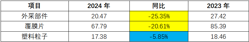 其次,上市公司所解释其单位成本降低的另一原因为,标的公司因采购量提升,故而能够以更低折扣或更优惠的付款条件进行原材料采购。而从主要原材料采购情况来看,标的公司2024年所购买的外采部件、覆膜片、塑料粒子的金额同比均出现大幅增长,分别为139.73%、94.27%、100.42%。但如下表所示,令人颇为不解的是,在其采购金额同比均基本翻倍的情况下,标的公司塑料粒子的采购均价降幅仅为5.85%,而反观其外采部件、覆膜片的采购均价降幅却分别高达25.35%、20.61%。两相比较之下,标的公司外采部件、覆膜片的供应商给予其如此大的折扣力度是否具备正常的商业合理性仍然待考。