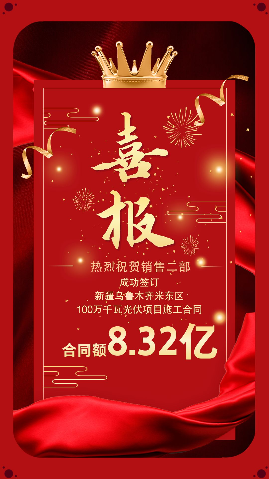 2023年8月,合纵科技销售二部EPC事业部团队成功签订“新疆乌鲁木齐米东区100万千瓦光伏项目”施工合同,合同金额高达8.32亿元,创下公司历史上最大的单体合同额订单,标志着合纵在智慧能源及EPC业务领域上迈出了坚实的一步,在新能源赛道实现了质的突破!