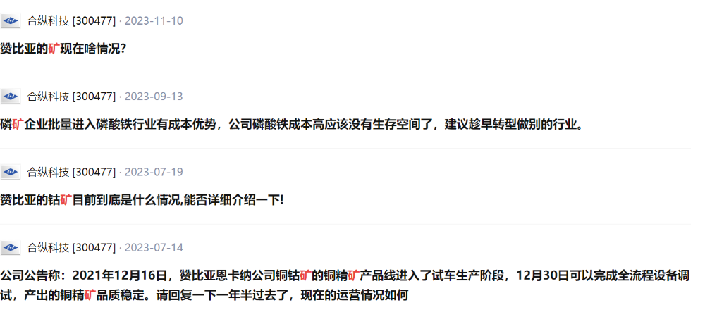 至于曾被资本市场广泛关注的天津茂联旗下赞比亚铜钴矿资产,合纵科技在近年财报中已甚少提及,但公司投资者对此事印象颇为深刻,不久前,有投资者在互动易就此事向公司提问,尚未获得答复。