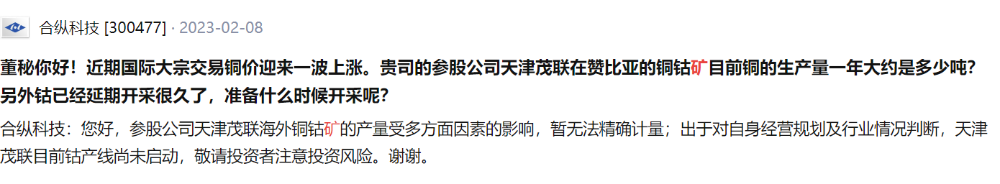 实际上,今年7月中下旬,即有投资者向合纵科技提问,然而至今时间已近半年,仍未获得公司答复。中国网财经记者发现,对于此事,公司最近作出实质性回复的时间为2月8日。彼时,公司表示,参股公司天津茂联海外铜钴矿的产量受多方面因素的影响,暂无法精确计量;出于对自身经营规划及行业情况判断,天津茂联目前钴产线尚未启动。