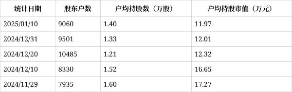 从1月15日公开信息显示,杭州高新截至2025年1月10日公司股东户数为9060户,较上期(2024年12月31日)减少441户,降幅为4.64%,变化不大。