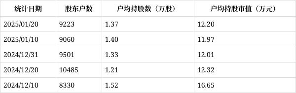 从1月22日公开信息显示,杭州高新截至2025年1月20日公司股东户数为9223户,较上期(2025年1月10日)增加163户,增幅为1.80%,变化不大。