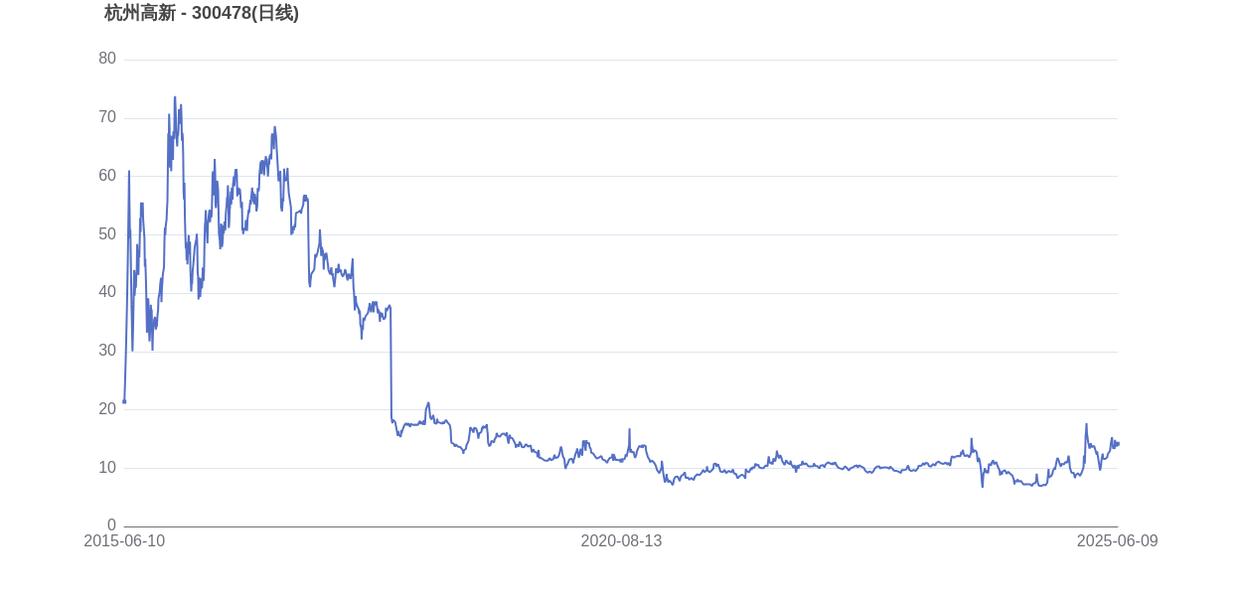 2015年12月4日,杭州高新的市值巅峰达到53.56亿元,股价也顺应升至80.34元。而至6月9日收盘,杭州高新的股价为14.17元,市值为17.95亿元,相比峰值时期市值减少35.61亿元,市值蒸发了66.49%。