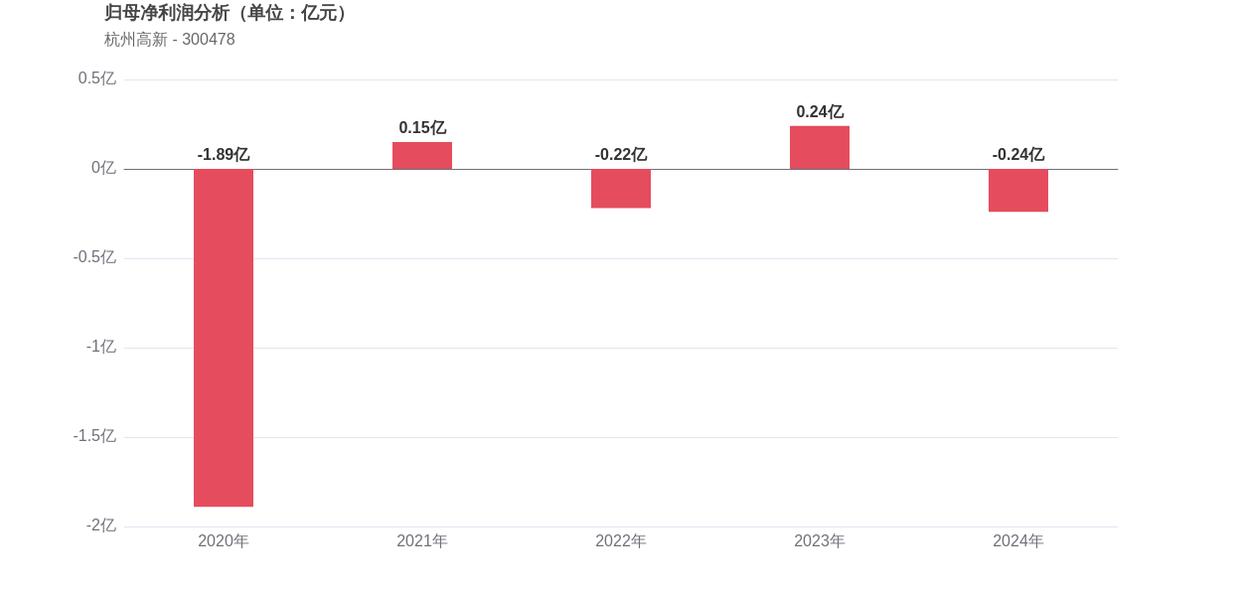 利润角度分析,2020年杭州高新实现归母净利润-1.89亿元,2024年-0.24亿元。虽然亏损幅度有所收窄,但公司仍未摆脱亏损局面。