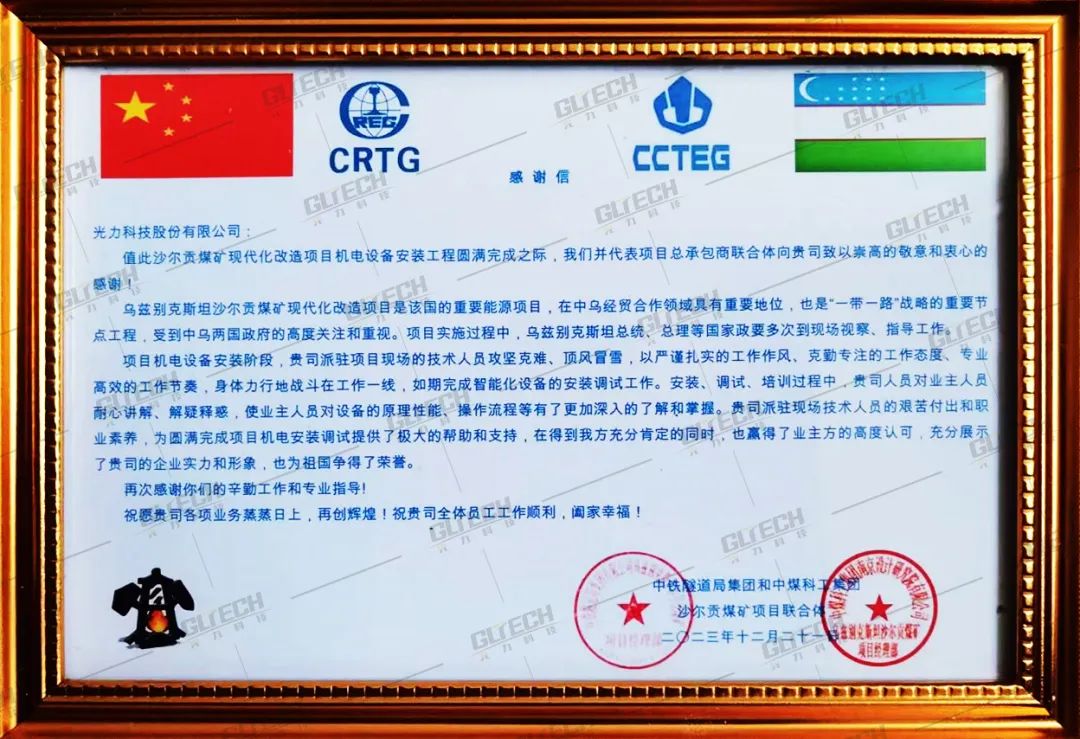 作为扎根中国、服务于安全生产管理领域的高新技术企业代表,光力科技积极响应国家“一带一路”政策,协办中国-中亚五国安全生产能力提升研讨会;积极走出去,成功参与了乌兹别克斯坦沙尔贡煤矿的现代化改造项目,并收到客户方的感谢信,用实际行动践行“中国产品向中国品牌的转变”。感谢信中写到: