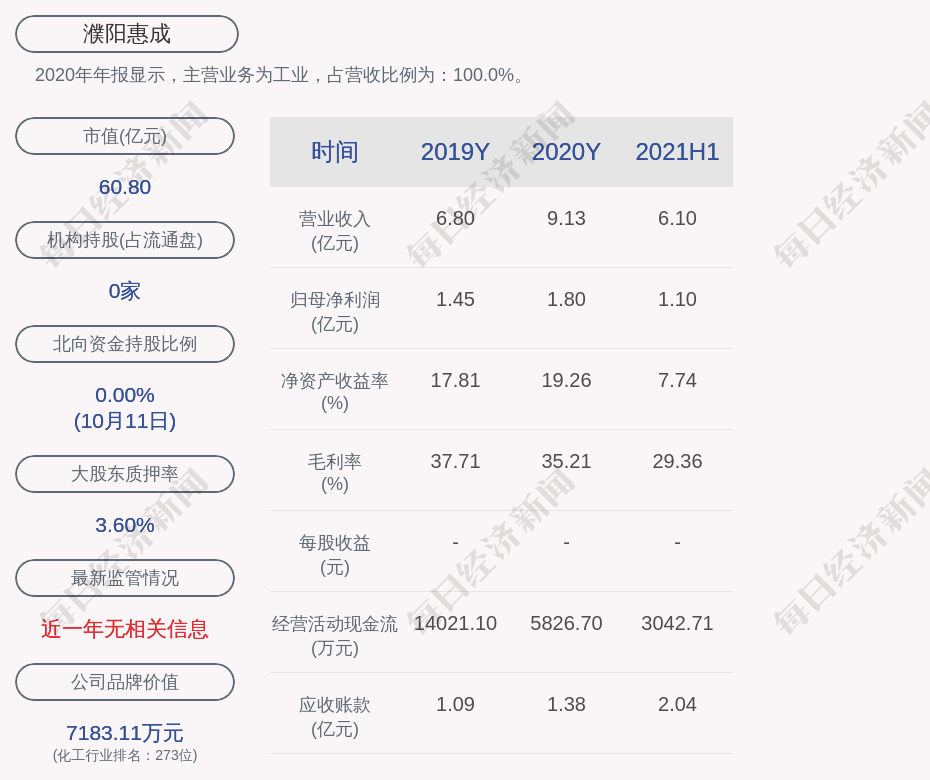 2020年年报显示,濮阳惠成的主营业务为工业,占营收比例为:100.0%。