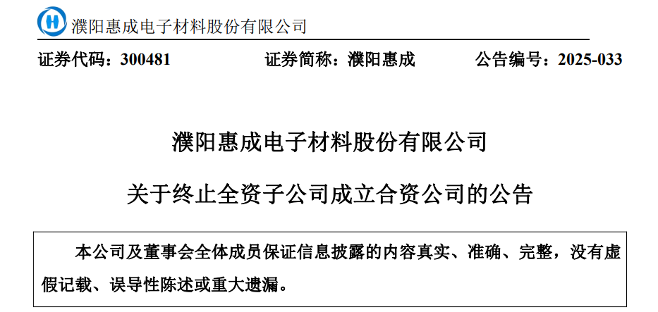 2025 年 4 月 25 日,濮阳惠成(300481.SZ)同步发布《2025 年一季报》与《终止全资子公司成立合资公司的公告》。