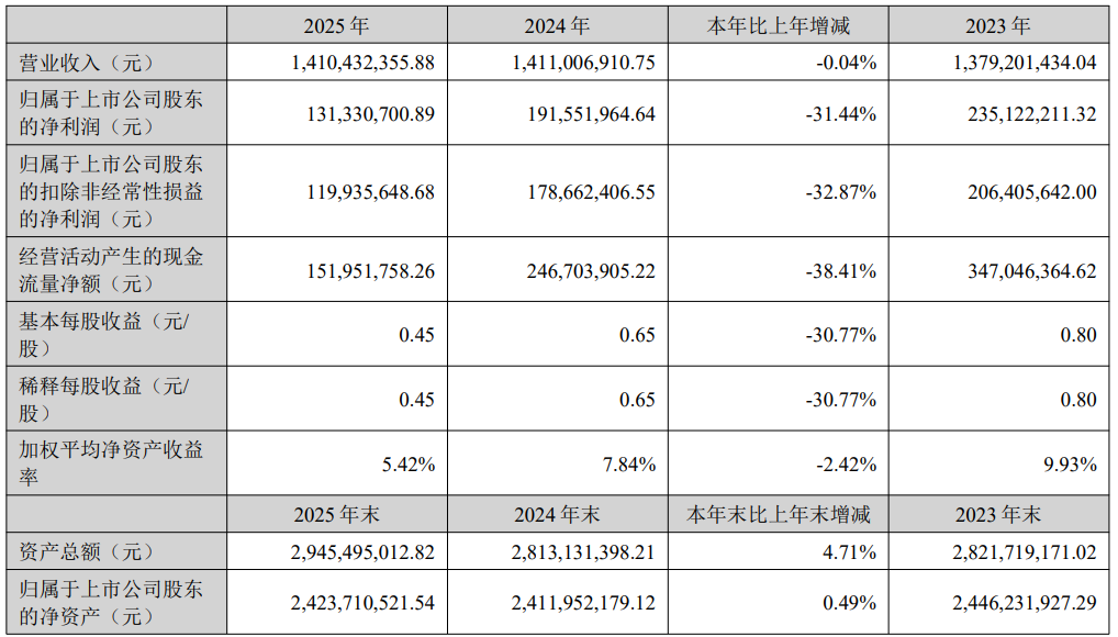 2025年度,濮阳惠成实现营收14.10亿元,同比下降0.04%;营业成本11.32亿元,同比增长2.63%;归母净利润1.31亿元,同比下降31.44%;扣非后归母净利润1.20亿元,同比下降32.87%。