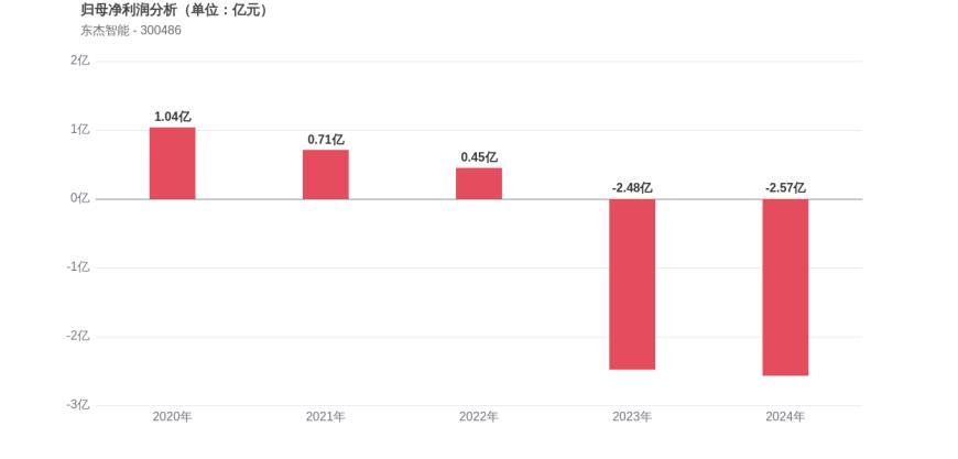 利润角度分析,2020年东杰智能实现归母净利润1.04亿元,2024年-2.57亿元。公司盈利状况从盈利转为亏损,经营压力加大。