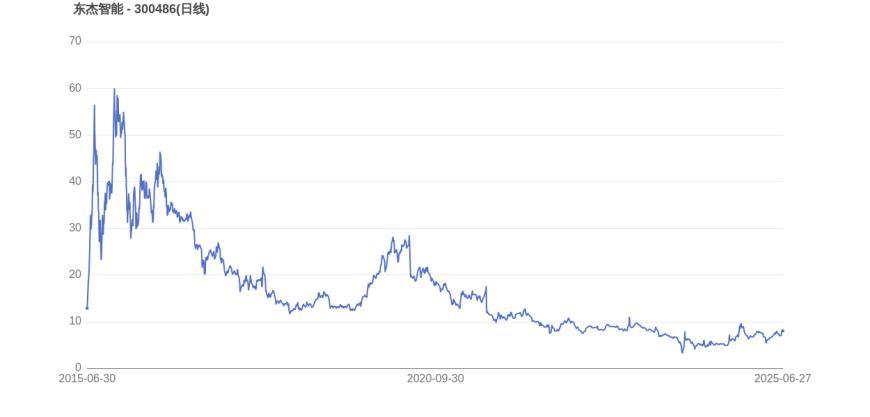 2015年11月12日,东杰智能的市值巅峰达到87.48亿元,股价也顺应升至63.0元。而至6月27日收盘,东杰智能的股价为8.03元,市值为32.73亿元,相比峰值时期市值减少54.75亿元,市值蒸发了62.58%。