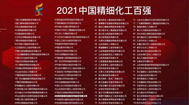 近日,“2021精细化工产业峰会暨中国精细化工百强发布会”在线上举行。会议隆重发布了“2021中国精细化工百强”榜单,西安蓝晓科技新材料股份有限公司位列48位,本次上榜系蓝晓科技(股票代码 300487)连续四年跻身中国精细化工产业前50强。