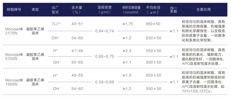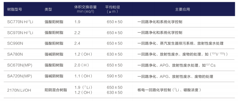 蓝晓科技自主开发的系列核级均粒树脂结构稳定、机械强度高、抗氧化性能强、杂质离子含量低,可有效控制核电厂一,二回路水质,达到核级应用要求。该系列可应用干蒸汽发生器排污系统(APG)、化学与容积控制系统(RCV)、反应堆和乏燃料水池冷却和处理系统(PTR)、硼回收系统(TEP)、放射性废液处理系统(TEU)等,具体产品介绍如下: