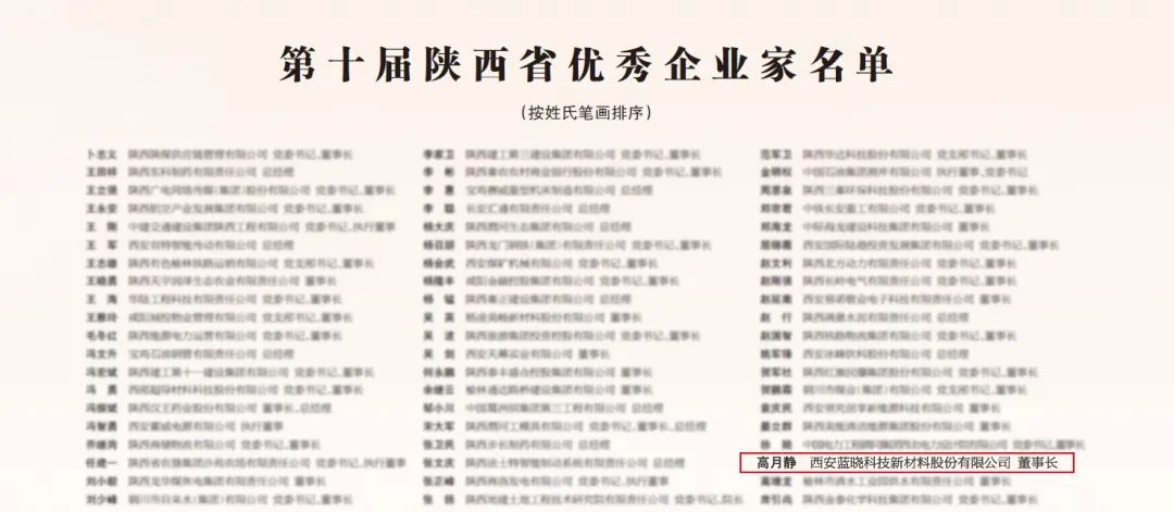 1月20日,“2023年陕西百强企业·第十届陕西省优秀企业家”表彰活动召开。蓝晓科技入选“陕西省民营企业50强”,公司董事长高月静博士获评“第十届陕西省优秀企业家”。