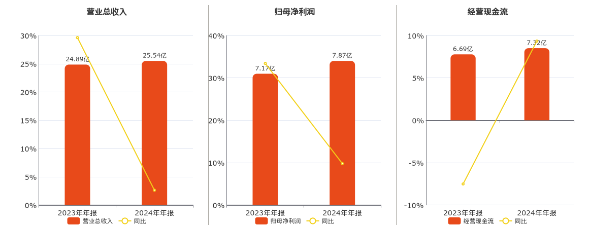 公司营业总收入为25.54亿元。归母净利润为7.87亿元。经营活动现金净流入为7.32亿元。