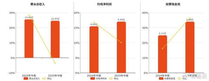 公司营业总收入为12.47亿元,较去年同报告期营业总收入减少4707.06万元,同比较去年同期下降3.64%。归母净利润为4.45亿元。经营活动现金净流入为2.88亿元。