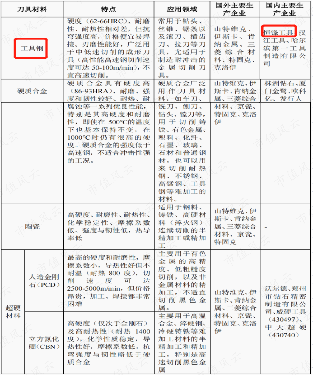 其次,恒锋工具刀具材料为工具钢,也是工具钢刀具领域唯一的独立上市公司,主流材料为硬质合金。