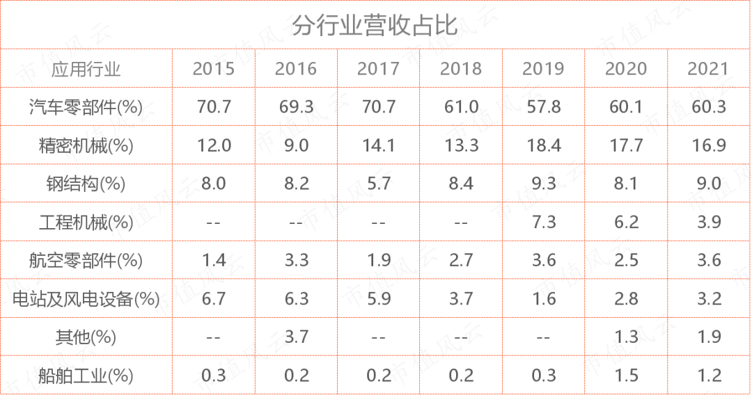 从营收结构来看,汽车零部件领域是营收的大头,2021年占比为60.3%。