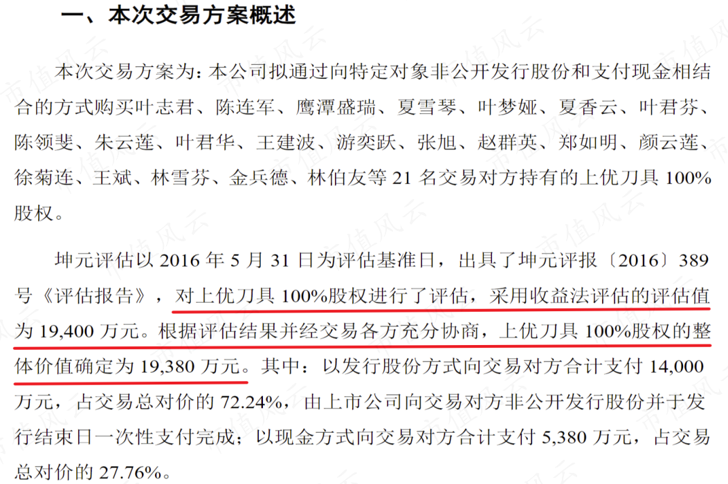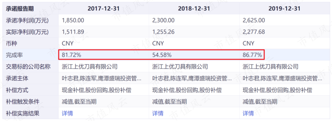 上优刀具收益法评估值为19400万元,同期净资产为3904万元,增值率高达396.9%,产生商誉约1.3亿。