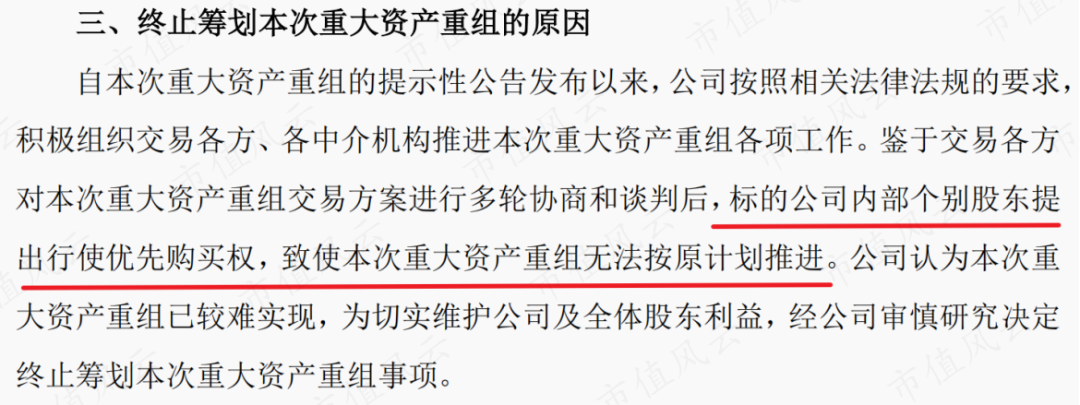 2023年1月16日,公司公告决定终止筹划本次重大资产重组事项。原因为标的公司内部个别股东提出行使优先购买权,致使本次重大资产重组无法按原计划推进。