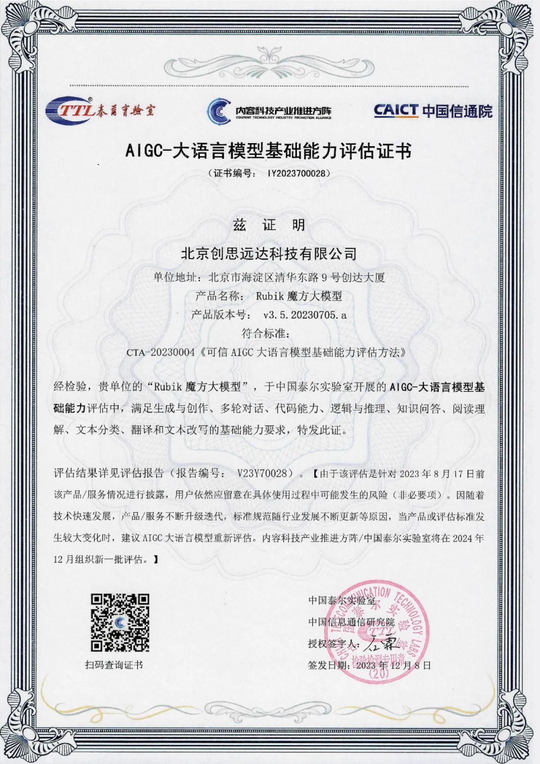 12月27日,由中国信通院主办的“2023年度内容科技与元宇宙产业大会”在北京成功举办。本次大会上,信通院揭榜第一批通过“AIGC-大语言模型基础能力测试”的企业名单,中科创达魔方大模型凭借功能丰富度以及性能的优越性荣誉上榜,顺利通过信通院可信AIGC大语言模型基础能力评估,成为首批获得可信证书的AI企业。