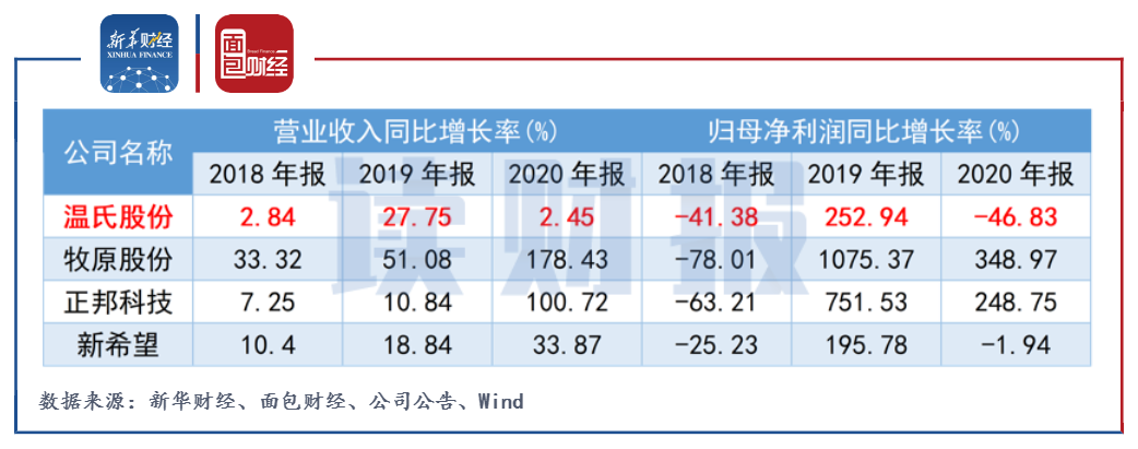 图1:2018年至2020年温氏股份与可比公司营收、归母净利润增速