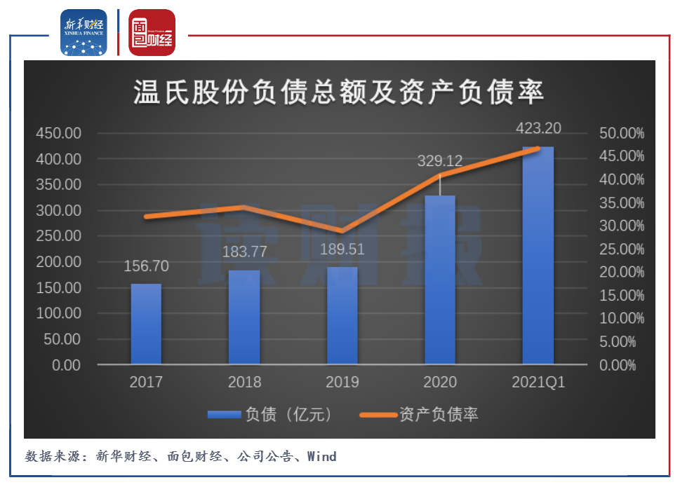 研究发现,公司近期负债增速较快。截至2020年年末,温氏股份负债总额达到329.12亿元,同比增长73.67%;2021年一季度,公司负债总额达到423.20亿元,资产负债率达到46.65%,较2020年年末上升5.77个百分点。