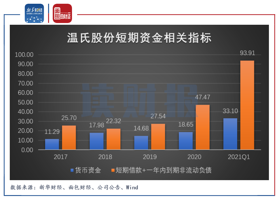 实际上,温氏股份的短期债务问题更为紧迫。2021年一季度,公司货币资金余额为33.10亿元,短期借款及一年内到期的非流动负债金额合计为93.91亿元,接近货币资金的3倍。
