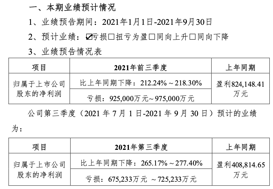 新希望则公告,预计第三季度亏损25.8亿元至29.8亿元,上年同期盈利19.2亿元;预计前三季度亏损59.95亿元至63.95亿元,上年同期盈利50.85亿元。