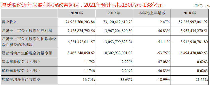 《电鳗快报》查阅历年财报发现,该公司盈利水平一直波动较大,但陷入亏损是在令人吃惊。据披露信息,该公司2018年至2020年分别实现净利润39.57亿元、139.67亿元和74.26亿元。