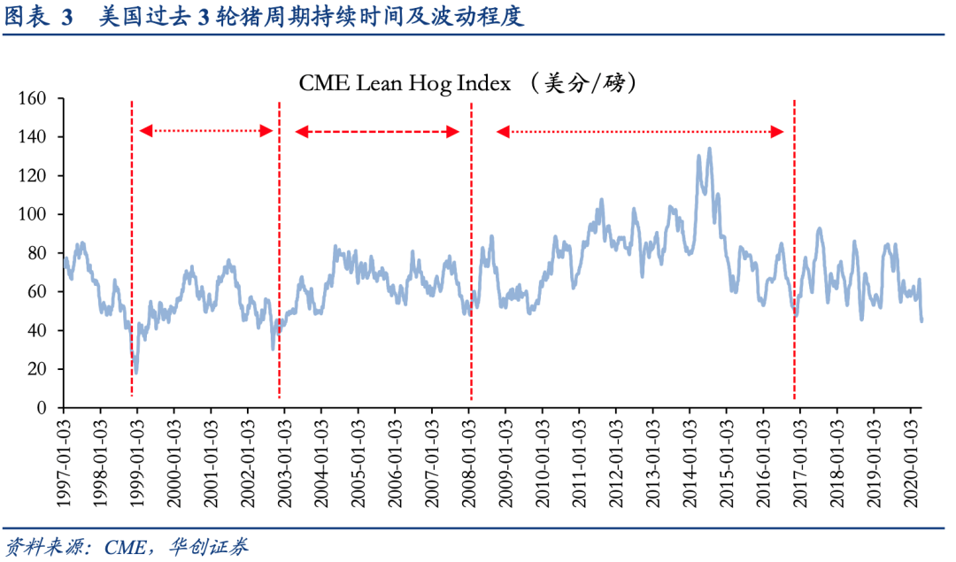可以看到,养殖规模化程度的提升并未消灭猪周期,只是相对于中国的猪周期,这种波动更频繁,但周期幅度较窄,伤害性弱一些。