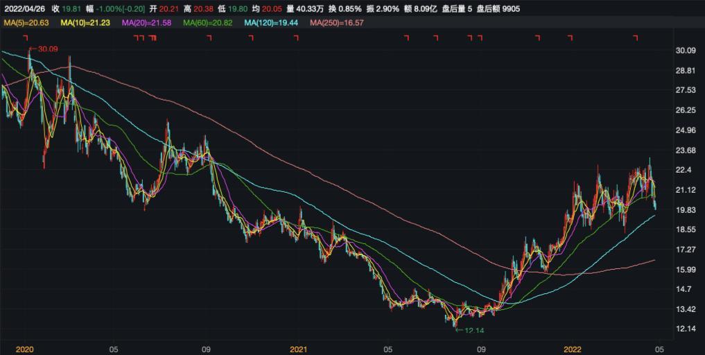 不过在二级市场,温氏股份股价从2021年下半年开始止跌反弹。2021年7月30日,温氏股份创下全年最低点12.14元/股,随后该股震荡上涨至今,期间最高涨幅达到90%。截至4月26日收盘,该公司股价报收于19.81元/股,总市值为1258.3亿元。