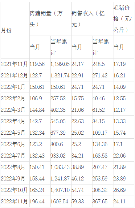 1、2022年11月,公司肉猪销售收入同比上升,主要是销量和销售价格同比上升所致。