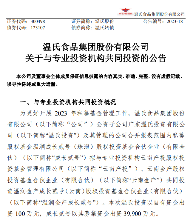 2月27日,温氏股份发布公告称,旗下温氏投资及其管理公司将与专业投资机构合作,开展2023年私募基金管理,此次拟于云南产投及云南金产展开合作,共同投资温润金产成长贰号(云南)股权投资基金合伙企业(有限合伙)。
