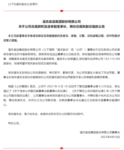 4月18日,温氏股份第四届董事会第十六次会议顺利召开,会议由温氏股份董事长温志芬主持,全体董事参加会议,监事列席。经记名投票表决,会议审议通过了《关于选举公司第四届董事会副董事长的议案》《关于聘任公司总裁的议案》和《关于聘任公司副总裁的议案》三项议案。根据表决结果,梁志雄先生当选公司副董事长,聘任黎少松先生为公司总裁,聘任赵亮先生、孙芬女士为公司副总裁,任期自董事会决议通过之日起至本届董事会届满时止。