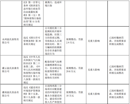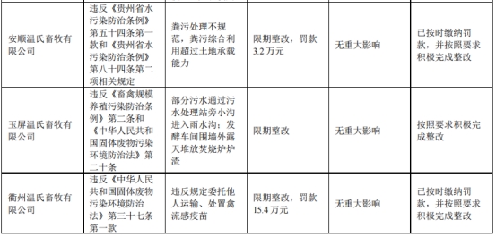 温氏股份表示,报告期内子公司肥东温氏畜牧有限公司、南陵温氏养猪有限公司、合肥温氏畜牧有限公司、水城温氏畜牧有限公司、敖汉温氏农牧有限公司、旬邑温氏畜牧有限公司、永州温氏畜牧有限公司、灌云温氏家禽有限公司、灌南温氏食品有限公司、安顺温氏畜牧有限公司、玉屏温氏畜牧有限公司、衢州温氏畜牧有限公司因环境问题受到行政处罚,具体情况如下: