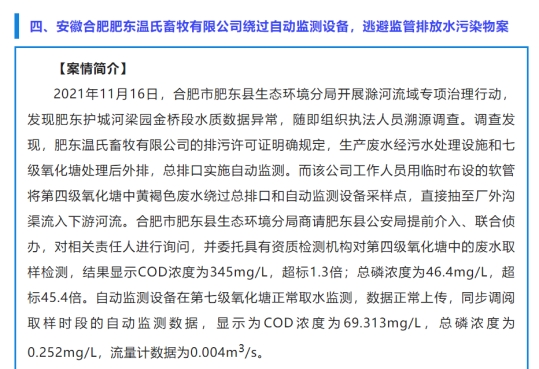 典型案例四安徽合肥肥东温氏畜牧有限公司绕过自动监测设备,逃避监管排放水污染物案显示,2021年11月16日,合肥市肥东县生态环境分局开展滁河流域专项治理行动,发现肥东护城河梁园金桥段水质数据异常,随即组织执法人员溯源调查。