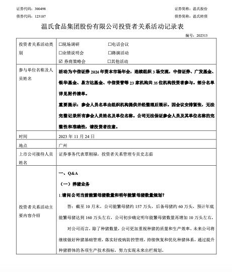 温氏股份还向投资者介绍了公司现阶段资金、债务情况及资金管理方法方面的情况。温氏股份称,近期猪价有所回落,再次降至行业平均成本线以下,行业重新陷入亏损状态,行业资金和偿债压力持续增大。