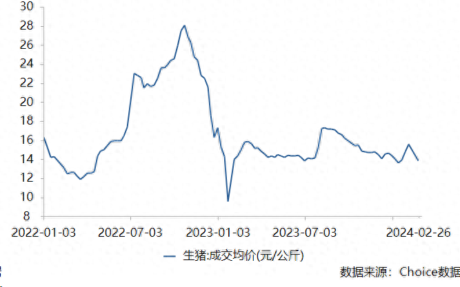 然而好景不长。2022年四季度起猪肉价格持续下行,且2023年全年维持低位运行,导致猪企利润受到大幅挤压,全年亏损严重。数据显示,全国生猪成交均价于2022年10月触及28.11元/公斤的高点,随后直线下行。最新价格为13.81元/公斤,仍在低位。