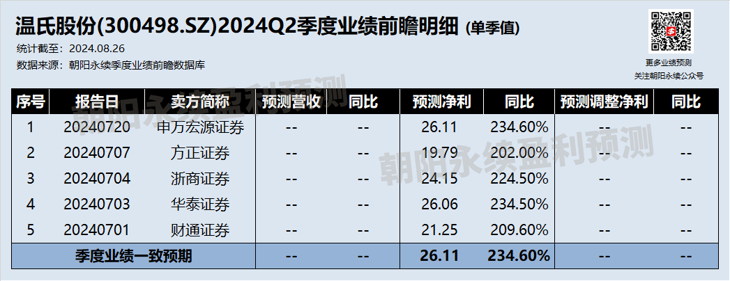 卖方分析师预测:温氏股份Q2单季预测净利润26.11亿元,同比增长234.60%;对于营收和调整后的净利润暂无预测值。