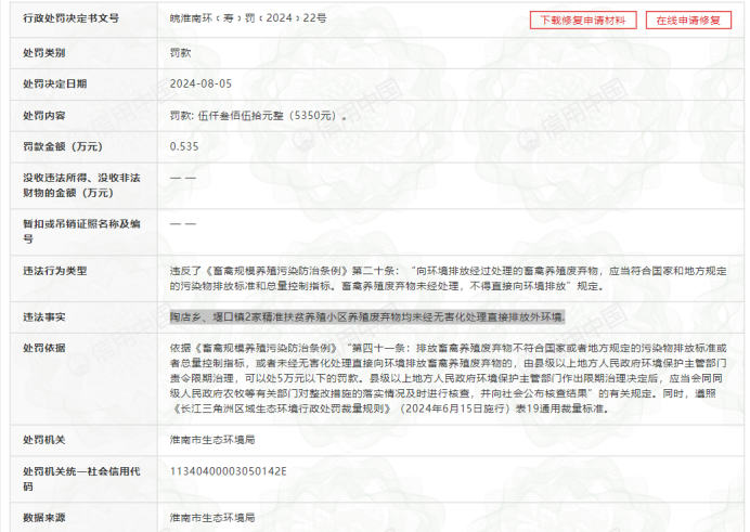 8月份,淮南市生态环境局对寿县温氏畜牧有限公司作出处罚,因为该公司陶店乡、堰口镇2家精准扶贫养殖小区养殖废弃物均未经无害化处理直接排放外环境,违反了相应的法律法规。