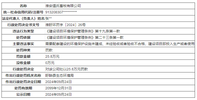 9月份,子公司淮安温氏畜牧有限公司因“需要配套建设的环境保护设施未建成、未经验收或者验收不合格,建设项目即投入生产或者使用”被盱眙环保部门处以25.8万元的罚款。而该公司在2017年、2019年时已经因为环保违法被主管部门处罚过。