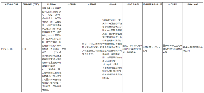 同样在7月份,还有重庆长寿温氏畜牧有限公司环保违法被处罚,处罚信息显示:2024年2月5日,重庆市长寿区环保执法人员现场调查发现,重庆长寿温氏畜牧有限公司位于新市街道的新市猪场水竹消纳地出口有浑浊黑色异味污水流出,污水来自猪场内芦苇消纳地。经取样监测,结果显示消纳地出口总磷浓度14.2mg/L,超过《畜禽养殖业污染物排放标准》表5规定的总磷排放浓度限值8mg/L。
