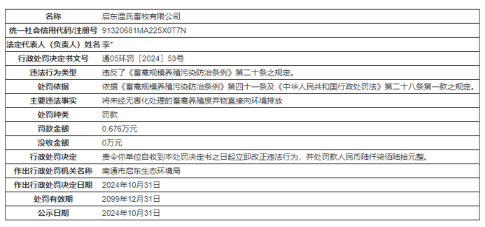 今年10月31日,温氏股份子公司启东温氏畜牧有限公司被启东生态环境局处罚了,原因是“将未经无害化处理的畜禽养殖废弃物直接向环境排放”。启东温氏畜牧在去年3月份已经因为环保违规被处罚过一次,原因是“未按照国家有关规定制定突发环境事件应急预案,未报环境保护主管部门备案”。