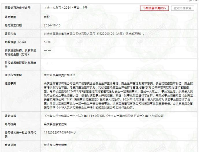 今年10月15日,余庆县应急管理局对温氏股份子公司余庆温氏畜牧有限公司下达了处罚决定。